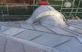 Erneuerung einer Dacheindeckung in Titanzinkblech walzblank, die Verlegung erfolgte in Doppelstehfalztechnik, einbinden von Kehlblechen.